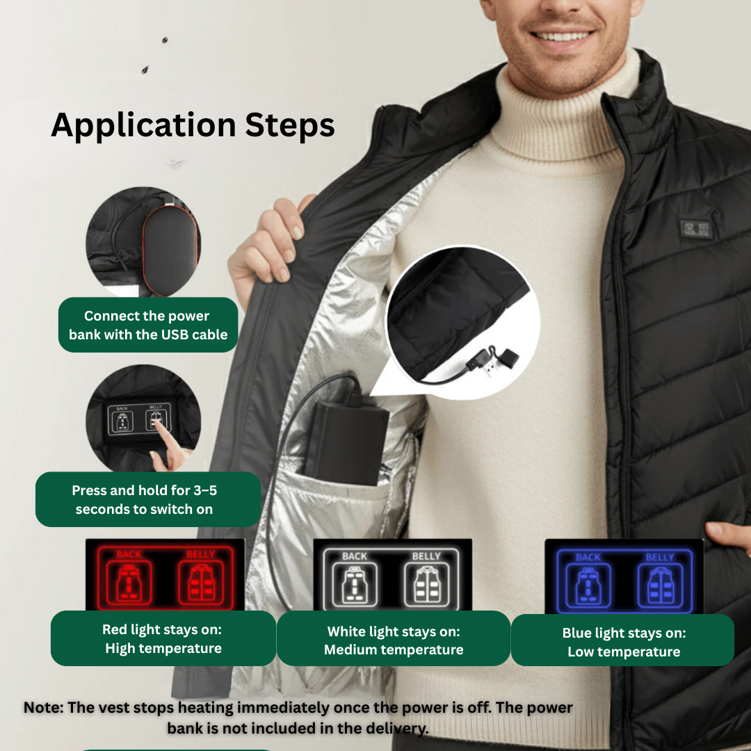 • Advanced Heating Zones – Nine strategically placed panels deliver targeted warmth across the chest, back, and waist.